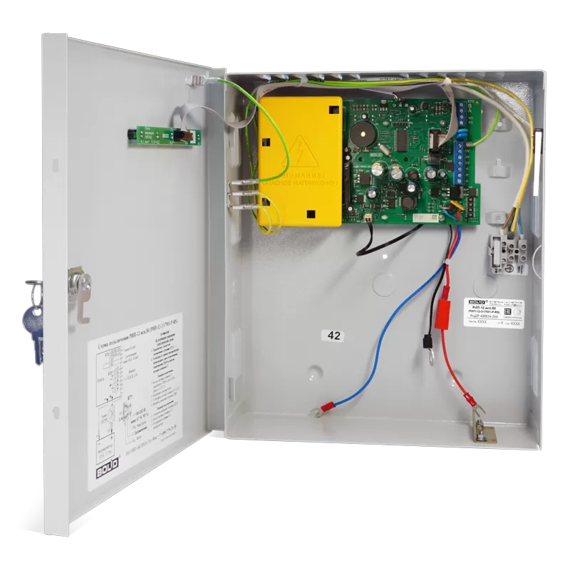 12В; 3А (мах 4А); емкость АБ 17Ач; световая индикация; звуковая сигнализация; датчик вскрытия корпуса; защита: от перенапряжения, от КЗ, от переполюсовки АБ; интерфейс RS-485.
