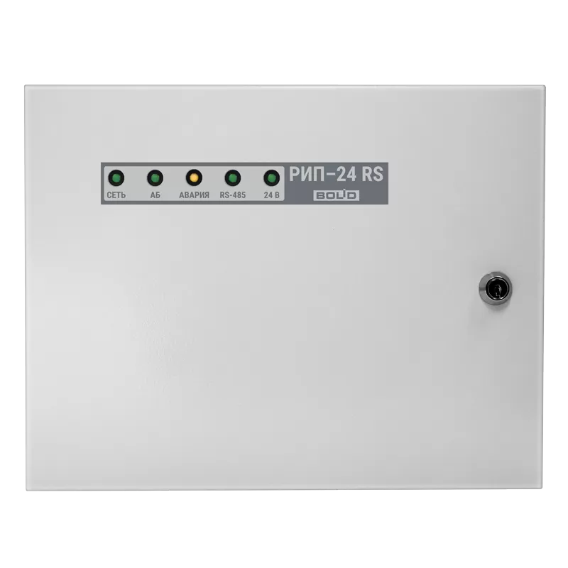 24В; 2А (мах 2.5А); емкость АБ 2*7Ач; световая индикация; звуковая сигнализация; датчик вскрытия корпуса; защита: от перенапряжения, от КЗ, от переполюсовки АБ; интерфейс RS-485.
